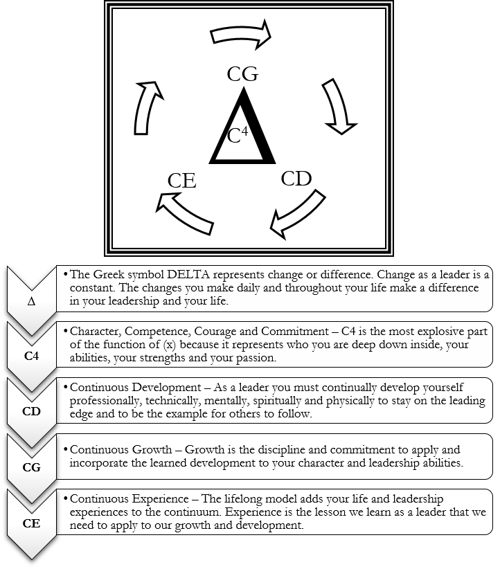 “This model demonstrates that learning is not a onetime event but a continuous process of continuous development (CD), continuous growth (CG), and continuous experience (CE) that you internalize to shape your Character, Competence, Courage, and Commitment (C4).The lifelong model adds a new concept of your experiences. Experience is the lesson we learn as a leader and are valuable lessons that we need to continuously apply to our growth and development.”